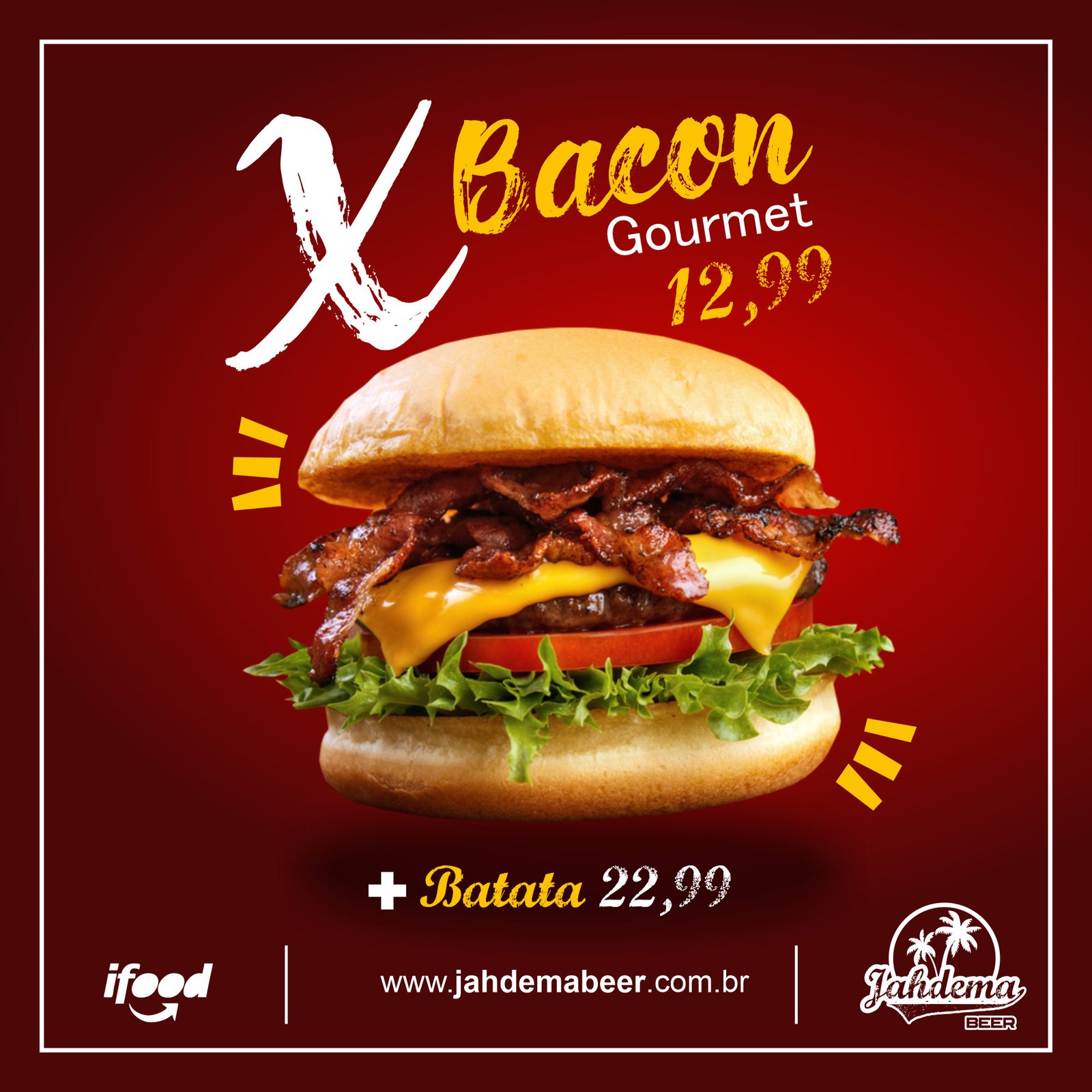 X-Bacon: Hamburguer Artesanal 100g, maionese, alface, tomate, bacon, queijo, pão de hambúrguer com ou sem gergelim.